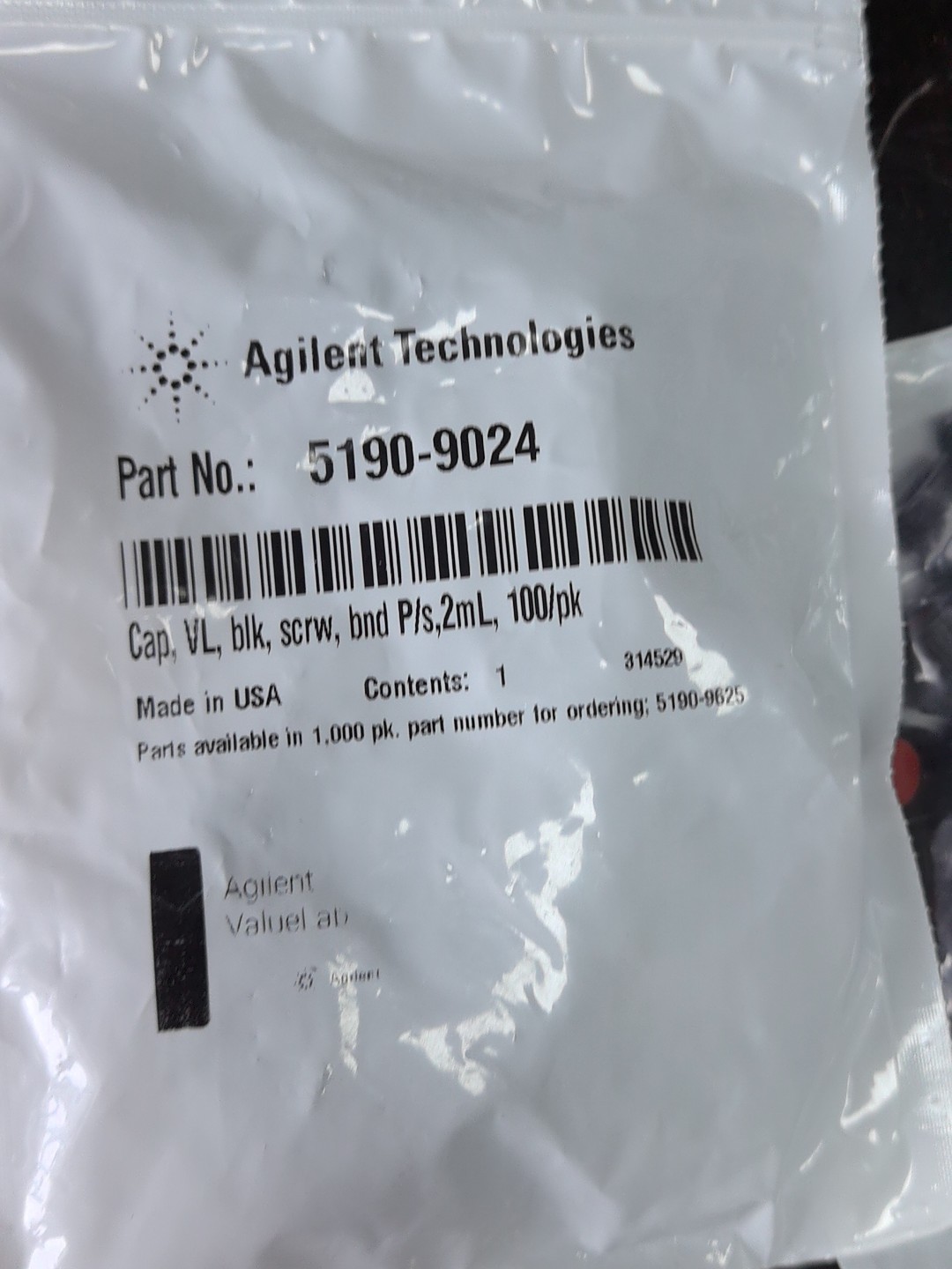 5190-9024 for Agilent liquid chromatography, gas chromatography, sample bottle cap 2 mL, 100/pk Cap, VL, blk, in stock, physical photography