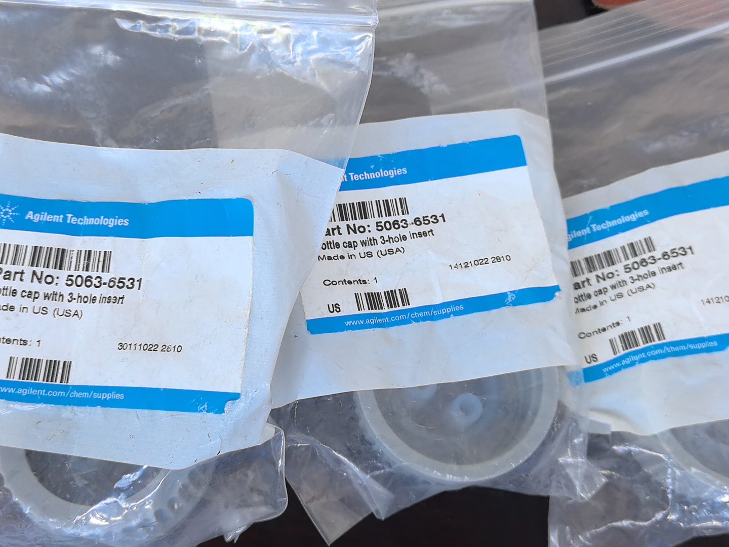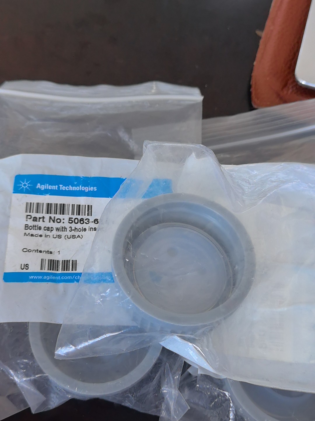 Agilent liquid chromatograph with brand new unopened bottle cap with 3 holes, liquid phase LC mobile phase bottle cap, part number: 5063-6531, photographed in person