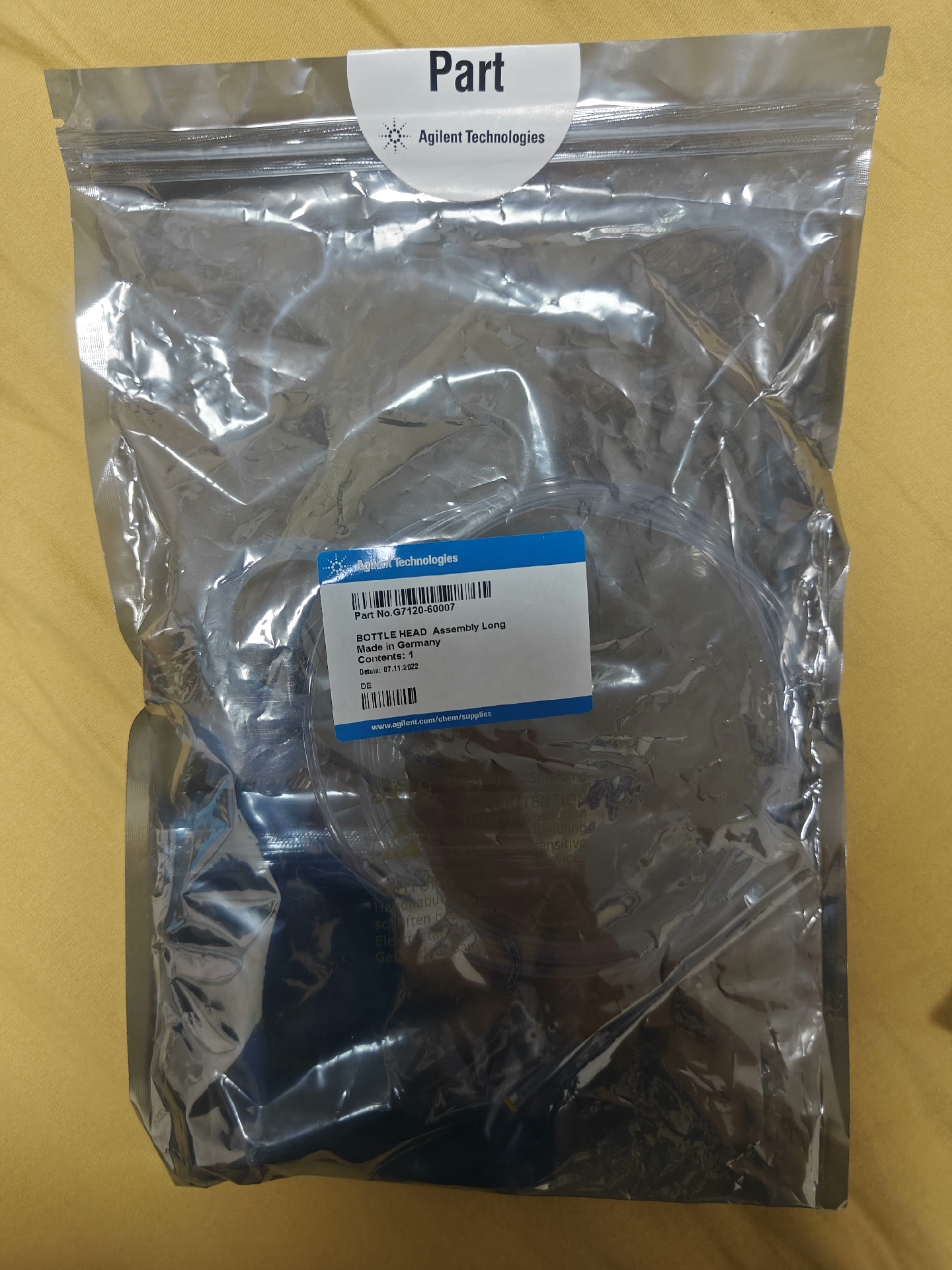 Agilent solvent tube assembly with solvent filter head on it.Agilent Liquid Chromatography Brand New Unopened Pipe Bottle Cap Set G7120-60007, with 20um Glass Filter Head.Brand new unopened.