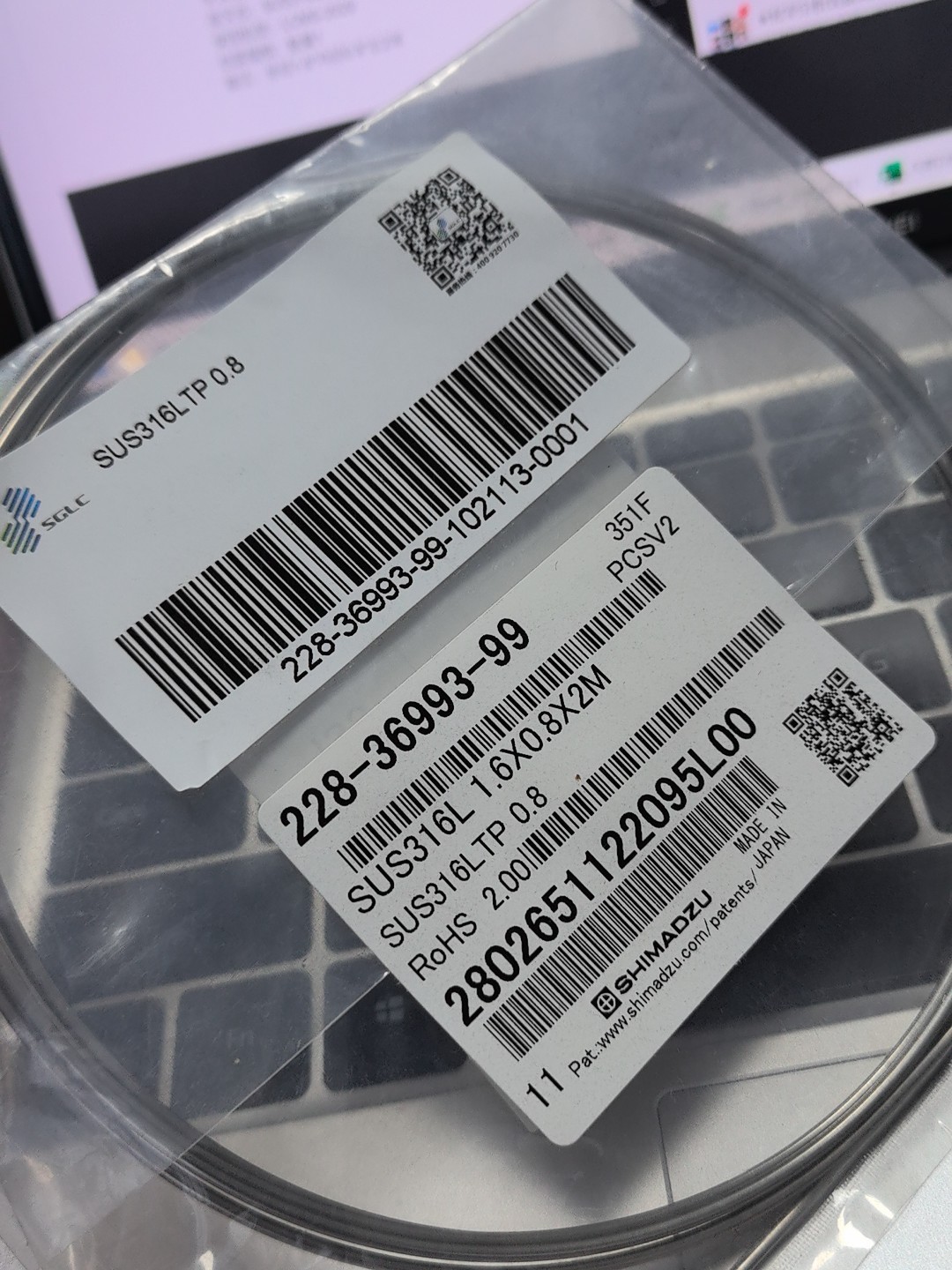 Shimadzu high performance liquid chromatograph, stainless steel pipeline for liquid mass chromatograph, SUS316LTP 0.8, outer diameter 1.6* inner diameter 0.8* length 2 meters, used for LCMS-2020 item number: 228-36993-99