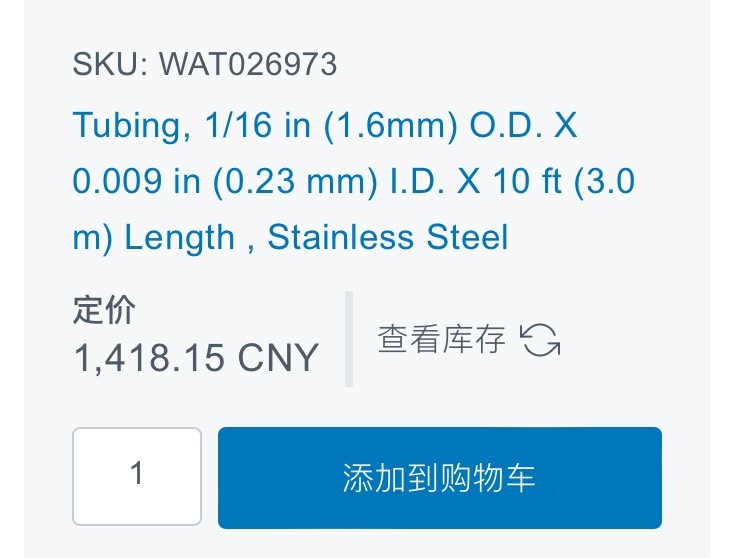 waters Waters, WAT026973 liquid phase HPLC line, new Tubing, 1/16 in (1.6mm) O.D. X 0.009 in (0.23 mm) I.D. X 10 ft (3.0 m) Length , Stainless Steel